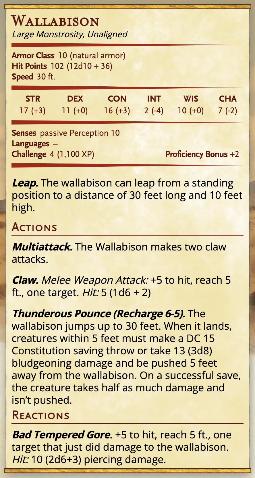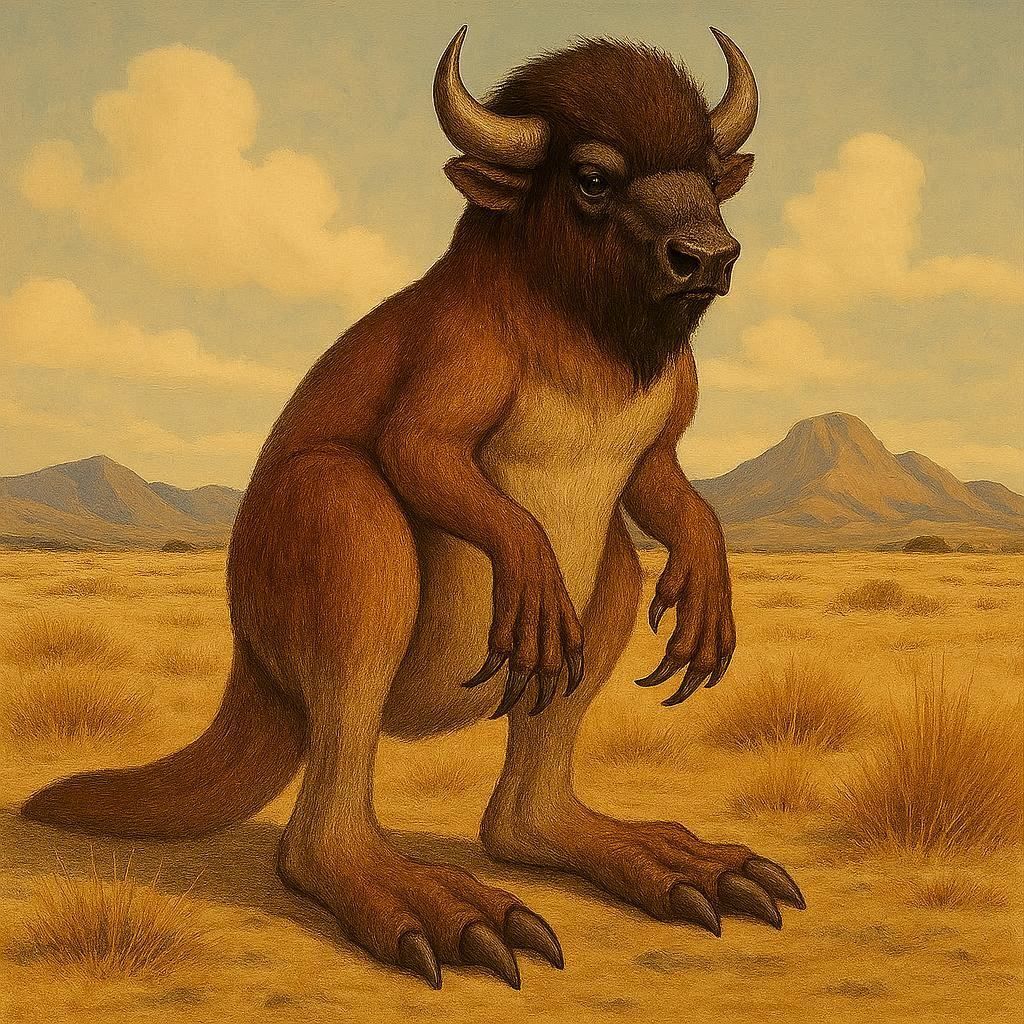 The wallabison has the shaggy, horned head of a bison set atop the tall body of a giant kangaroo. Its hind legs launch the creature across ravines, fences and even city walls. When a wallabison lands, its thunderous stomp cracks stone, flattens crops, and bowls over armored soldiers. Herds of wallabison move in coordination, bounding in great arcs that churn grassland into wasteland.